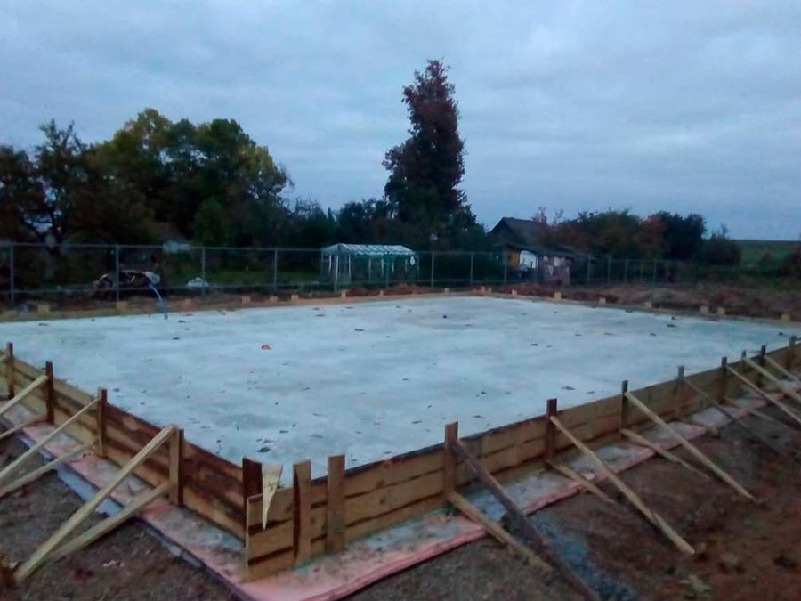 Все, после этого площадку можно заливать бетоном. Марка бетона должна быть не менее М300. Бетонная смесь распределяется по всей опалубке, которой определяется и ее горизонтальность, и выравнивается при помощи деревянной рейки.